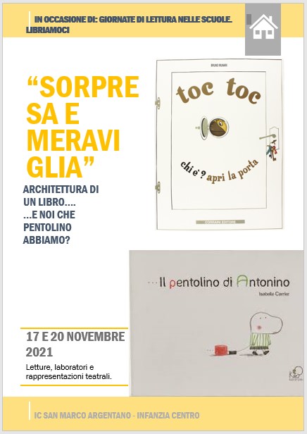 Nella prima attività presenterò ai bambini il libro come fonte di sorpresa e meraviglia.....uno strumento capace di mettere in moto la nostra creatività. Seguirà la lettura ad alta voce del libro 'Toc Toc. Chi è? Apri la porta' di Bruno Munari. Nella fase successiva, ispirata al metodo dello stesso autore, i bambini costruiranno ognuno il proprio libro, con creatività e fantasia, sperimentando materiali e formati diversi. Nella seconda attività proporrò la lettura ad alta voce del libro 'Il pentolino di Antonino' di Isabelle Carrier, usando il teatro Kamishibai. Grazie a questa lettura seguirà una conversazione guidata sui temi della diversità e della difficoltà che sfocerà con una rappresentazione teatrale della storia ascoltata. Il tutto sarà incorniciato dalla data del 20 novembre, la 'Giornata Mondiale dei Diritti dei Bambini' che coincide con la chiusura di questa Campagna di lettura di Libriamoci 2021. Sarà un momento di crescita per i bambini, volto a capire che qualsiasi pentolino ci portiamo dietro...abbiamo dei diritti che ci proteggono, per mirare a un futuro senza discriminazioni e senza disuguaglianze.